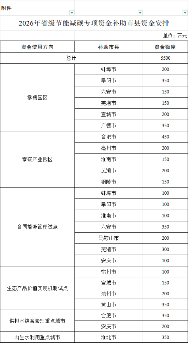 補貼政策補助超五千萬!安徽2026年省級節能減碳專項資金補助市縣資金安排公示