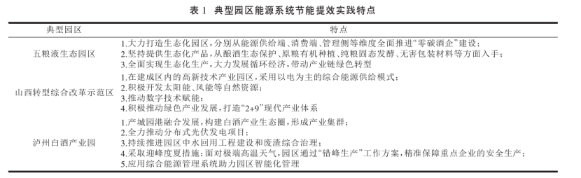 園區在推動我國實體經濟發展和城鎮化發展中發揮了關鍵作用,是支撐制造強國戰略的主戰場。有研究表明,園區二氧化碳排放量約占全國總排放量的31%[4],園區是資源能源消耗最集中的地方。現階段,為了節約能源,保護環境,我國各級園區都在持續推動綠色低碳發展。田金平等研究指出我國工業園區節能提效實踐創新主要體現在以下5個方面: ①聚焦重點領域,全過程系統性推進節能工作。②集中式能源基礎設施升級改造,多樣化開發利用余熱、 余壓和能量多級利用。③積極利用可再生能源,推進能源結構轉型升級。④積極開展智慧能源探索,實現能源全過程精細化管理。⑤建立健全能源管理體系。表1為典型園區能源系統節能提效實踐特點。