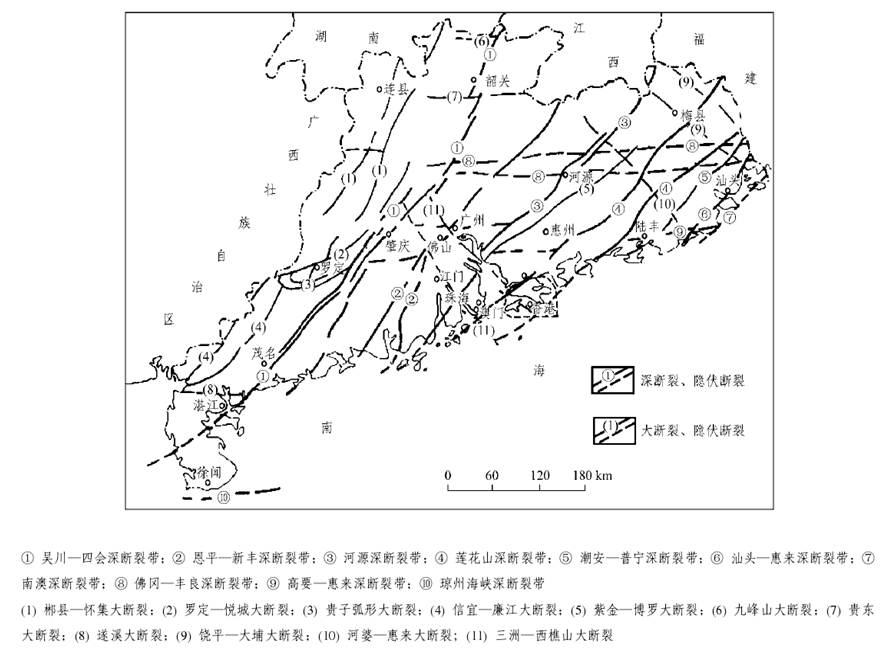廣東省在大地構(gòu)造上屬華南褶皺系的一部分,其演化過(guò)程經(jīng)歷了三個(gè)發(fā)展階段及相應(yīng)的構(gòu)造旋回和構(gòu)造運(yùn)動(dòng):加里東運(yùn)動(dòng)形成緊密線(xiàn)型褶皺,主要呈NEE方向,成為廣東省構(gòu)造骨架的基礎(chǔ);印支運(yùn)動(dòng)形成多方向的過(guò)渡型蓋層褶皺;燕山運(yùn)動(dòng)以斷塊造山、NE向和EW向深大斷裂控制的火山噴發(fā)、巖漿侵入為主。深大斷裂對(duì)廣東省的沉積建造、巖漿活動(dòng)、變質(zhì)作用和成礦作用有較明顯的控制。主要的深斷裂有吳川-四會(huì)、恩平-新豐、河源、蓮花山、潮安-普寧、汕頭-惠來(lái)、南澳、佛岡-豐良、高要-惠來(lái)、瓊州海峽等,主要的大斷裂有郴縣-懷集、羅定-悅城、貴子、信宜-廉江、紫金-博羅、九峰山、貴東、遂溪、饒平-大埔、河婆-惠來(lái)、三洲-西樵山等。這些深大斷裂都具有規(guī)模大、活動(dòng)時(shí)間長(zhǎng)等特點(diǎn)。從總體上看。廣東省境內(nèi)大型褶皺和深大斷裂以NE向?yàn)橹鳎g夾EW向和NW向構(gòu)造組成復(fù)雜的構(gòu)造圖景。