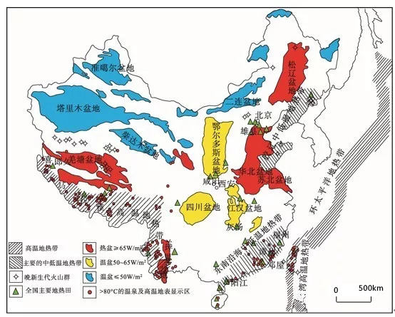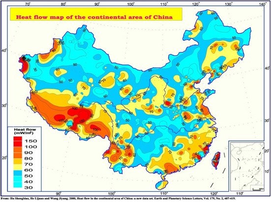 中國東部,高地溫梯度異常區多分布于松遼盆地華北盆地及東南沿海地區,地溫梯度多在4-5.°C/100m,最高可達7-8°C/ 100m,其分布多呈條帶狀,北東向延伸同地溫分布規律一致。