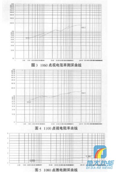 (2)在100線1060、1100點上進行電阻率測深, 從二個點的曲線形態來看,曲線形態相似且地層分層明顯;70~200m層位穩定,基本為砂巖(見圖3~4)。