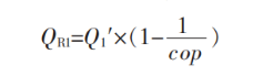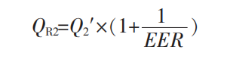 式中:QR1 為巖土體提供熱量;Q1′為建筑空調(diào)總熱負(fù)荷, 2963 kW;cop 為熱泵機(jī)組制熱性能系數(shù),5.0。由式(1)得QR1=2370.4 kW, 即巖土體吸熱量2370.4 kW,滿(mǎn)足建筑供暖需求。巖土體制冷量計(jì)算見(jiàn)式(2)。